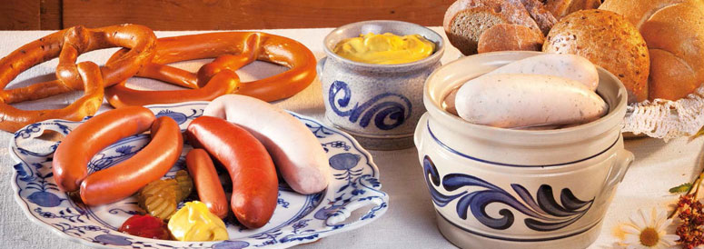 31122 - Suino e bovino, impasto fine, budello naturale, curvo, calibro piccolo, affumicato. Confezione sottovuoto da 2 paia, peso ca. 250 g, lunghezza Würstel ca. 16 cm